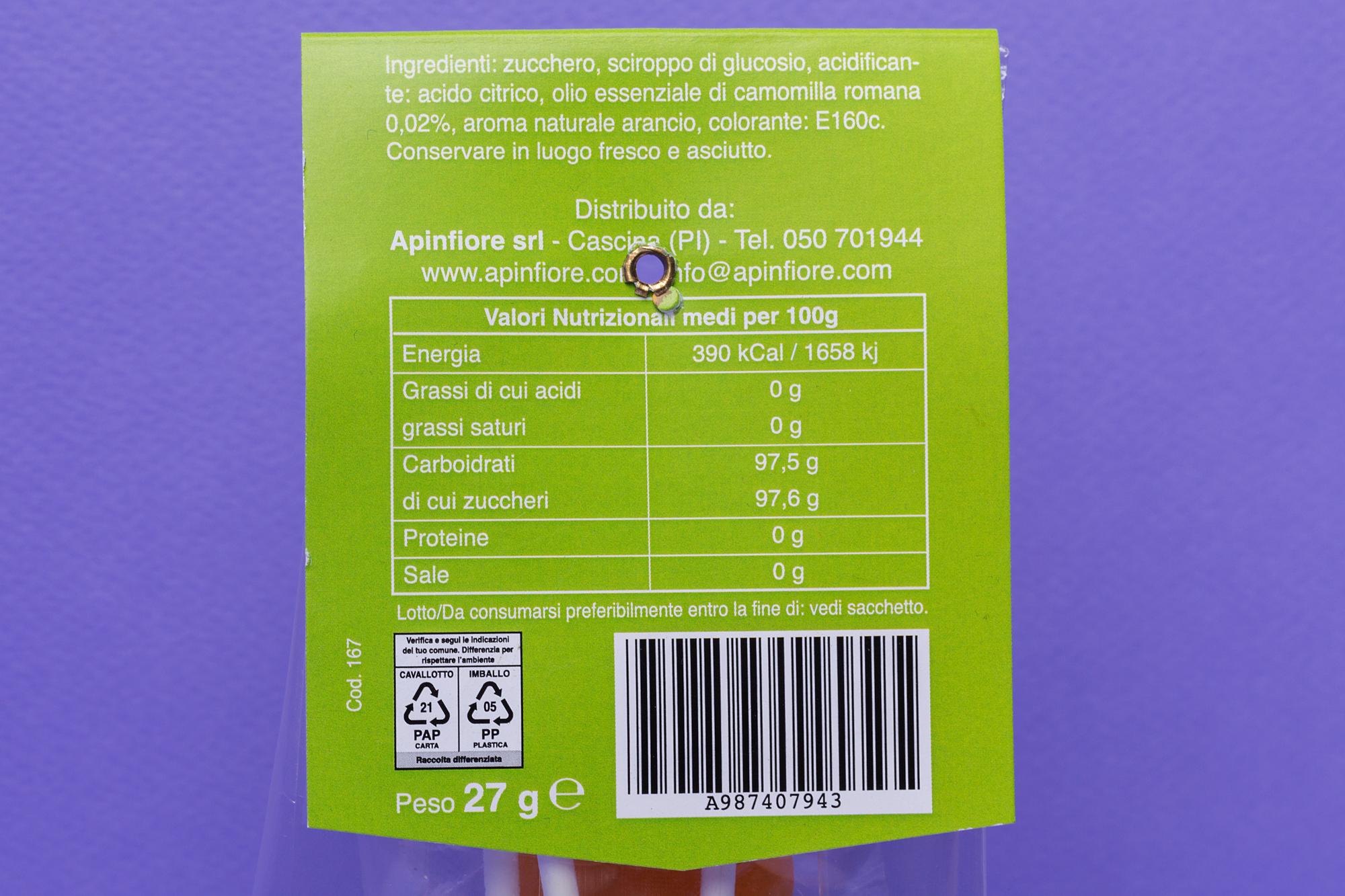 Zucchero, Sciroppo di Glucosio, Acidificante: Acido Citrico, Olio Essenziale di Camomilla Romana 0,02%, Aroma Naturale Arancio, colorante E160c.