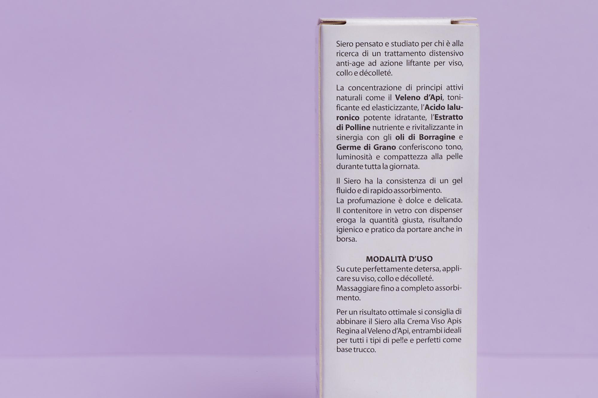Per un risultato ottimale si consiglia di abbinare il Siero alla Crema Viso Apis Regina al Veleno d’Api, entrambi ideali per tutti i tipi di pelle e perfetti come base trucco.