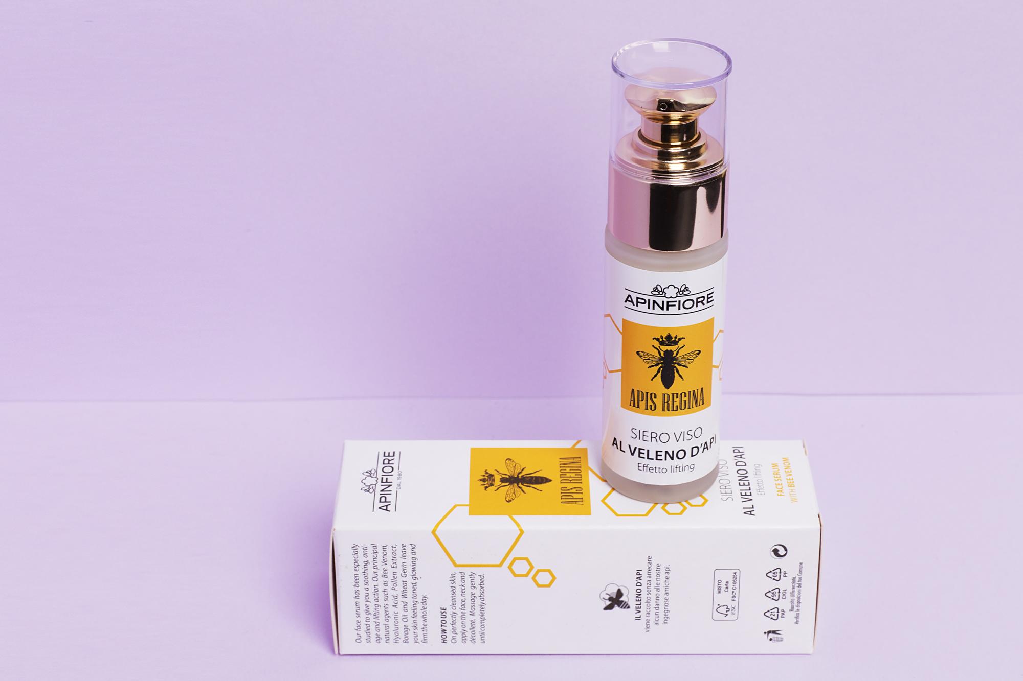 Il siero al veleno d’api della linea Apis Regina, è formulato per chi è alla ricerca di un trattamento distensivo anti-age ad azione liftante per la pelle del viso, collo o décolleté.