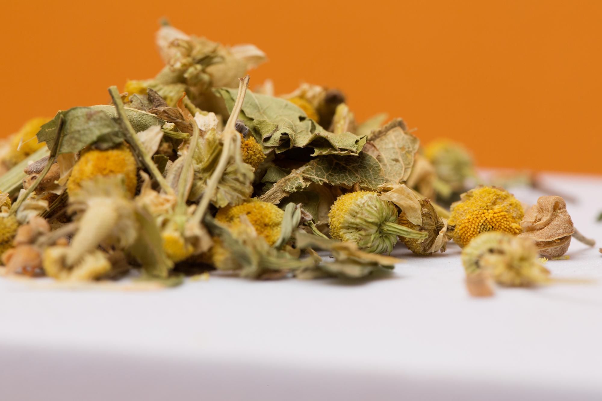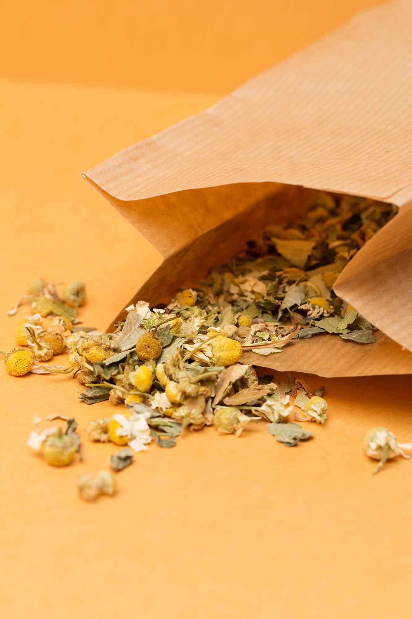 Camomilla, finocchio semi, tiglio fiori e bratte, salice corteccia, maggiorana foglie, melissa foglie, menta piperita, passiflora, biancospino fiori e foglie, lavanda fiori, asperula foglie.